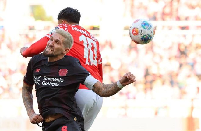 勒沃库森排出3421阵型。科法内顶在最前面。波库和霍夫曼联袂出击。格里马尔多、阿莱士-加西亚、费尔南德斯和阿图尔联袂出击。塔普索巴、安德里希和巴代3后卫首发出战。弗莱肯担任首发门将。勒沃库森首发阵容总身价1.85亿欧元。而美因茨首发阵容总身价只有9300万欧元。